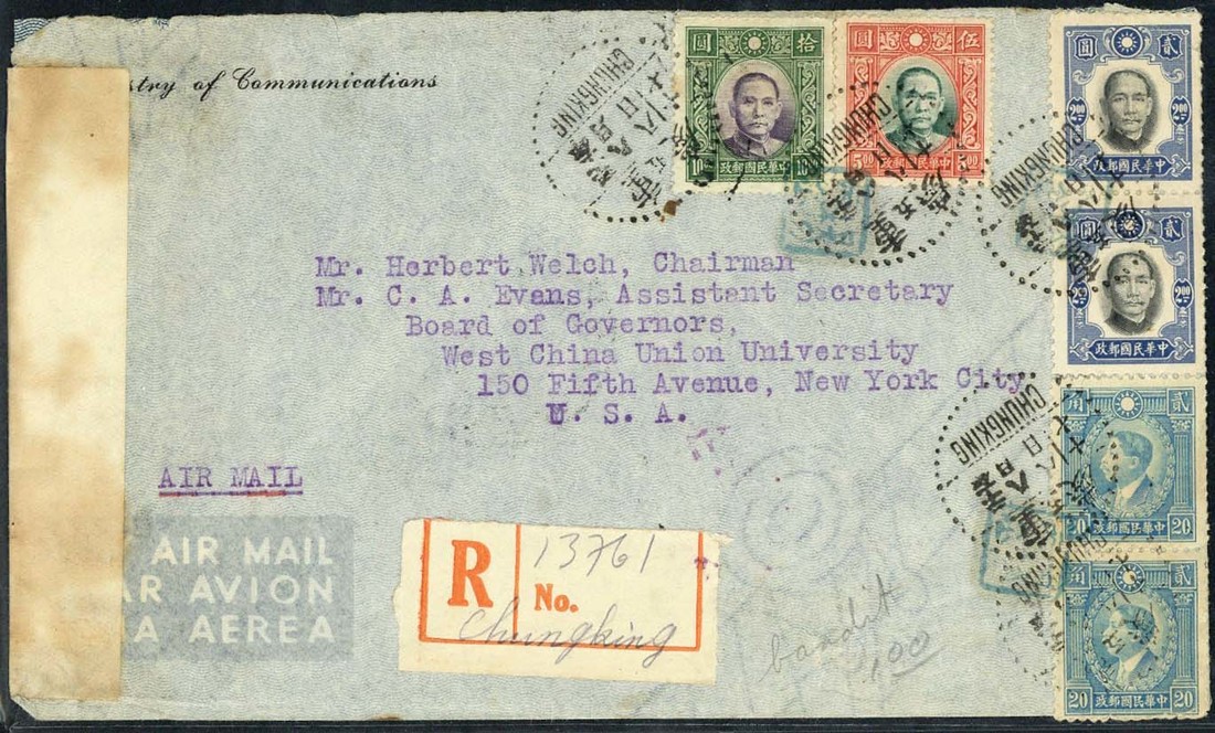 1942 (8 Aug.) air mail envelope registered to New York bearing $19.40 franking tied by Chungking dotted datestamp with the registration label below with manuscript endorsement, censor seal at side with U.S. transit and arrival datestamps on the reverse via Miami. Carried over route 8
