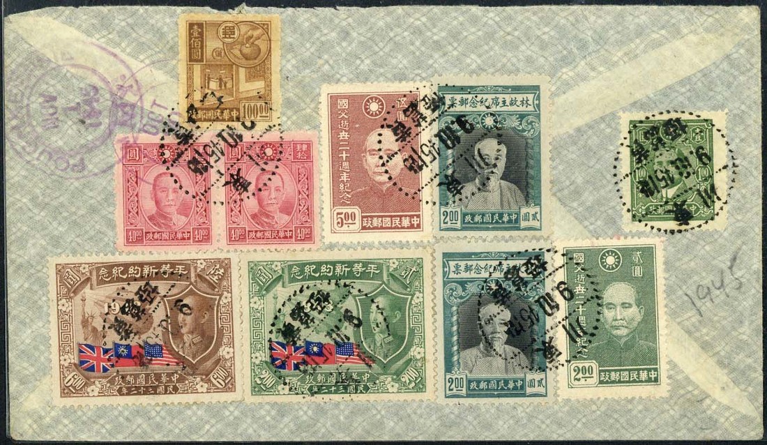 1945 (9 Oct.) air mail envelope registered to U.S.A. bearing, on the reverse, colourful $200 franking tied by Chungking dotted datestamp, the address side with red on cream registration label and red on turquoise airmail etiquette. Typed instruction changed to read "By Air to U.S.A." Carried on route 8, N.A.L. to Calcutta, B.O.A.C. to Lagos, P.A.A. to Miami via Brazil, Port of Spain and San Juan