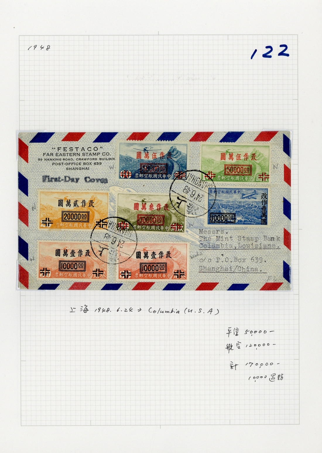 1946-48 a group of covers bearing a variety of airmail and other adhesives including C.N.C. values on first day cover, printed paper rate to U.S.A., express cover from Tungshan to Tsingtau, Nanking to U.S.A. and Tientsin to U.S.A. (5 covers)
