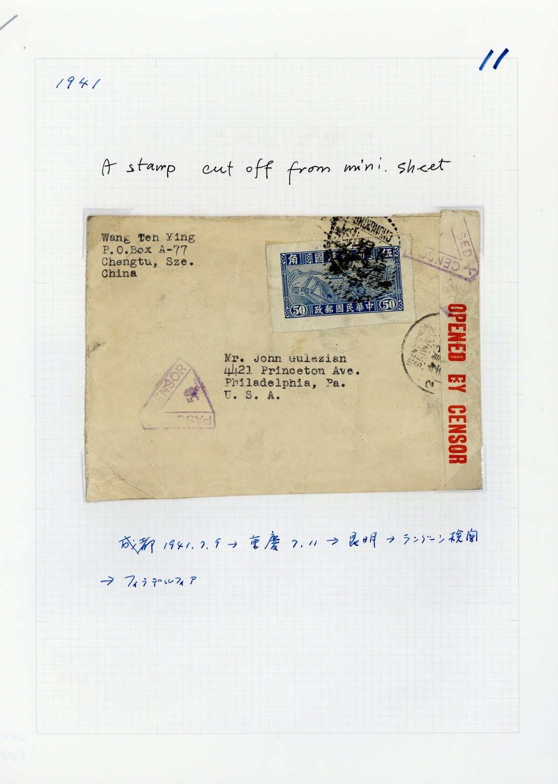 Rangoon: 1941-42 a group of covers to U.S.A. (2), Australia and United Kingdom (3) from various cities in China bearing different frankings, each with censor seal and various censor handstamps applied in Rangoon, Burma. Some better frankings including anti-bandit chop. (6 covers)
