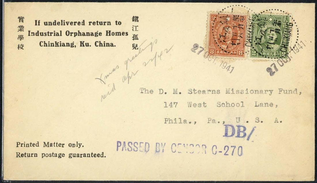 1941 (27 Oct.) printed paper rate cover to U.S.A. bearing 10c. franking tied by Chinkiang dotted datestamp and despatcher's datestamp, with censor handstamps and manuscript "Xmas greetings rec'd Apr 22/42". Fine and taking over six months for delivery