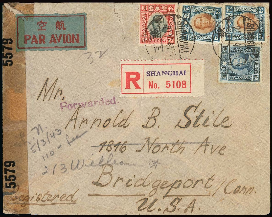 1941 (21 Nov.) envelope sent registered air mail to U.S.A. bearing $9.50 franking tied by Shanghai c.d.s. with the registration label alongside and with red on blue Par Avion etiquette, with U.S. censor seal at left and, on the reverse, New York Foreign and Registration dated ovals for 1943 (28 Apr.) plus Bridgeport arrival (2.5). Some wrinkling, taking over seventeen months to be delivered. Photo