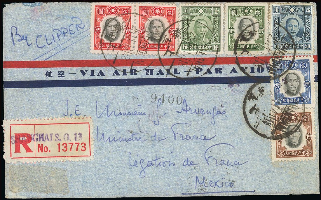 1941 (25 Nov.) air mail envelope registered to Mexico "By Clipper" bearing $23.60 franking tied by Shanghai c.d.s. with the registration label in lower corner, with despatch and arrival c.d.s. 1943 (6 May) on the reverse. Triple 5g. franking and carried on route 3, taking eighteen months to be delivered. Photo