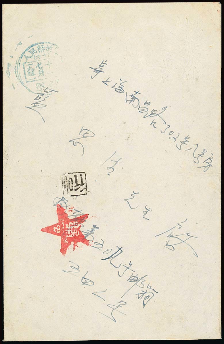1951 (11 July) stampless military cover to Shanghai bearing Liberation Army No. 16 c.d.s. in turquoise, red star and examiner's mark, the reverse with Shanghai arrival. Vertical fold, fresh. Photo