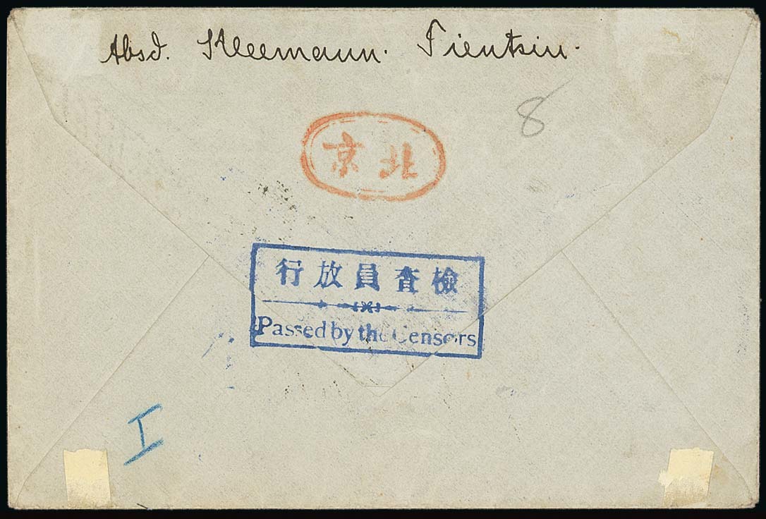 1919 envelope addressed to Munich bearing a boxed handstamp "Kriegsefangenen Sendung" with Berlin W.S. handstamp and arrival c.d.s. (7.7); the reverse indicates that the letter was sent from Tientsin and bears a fine strike of Peking bilingual "Passed by the Censors" struck in blue; fine. Photo