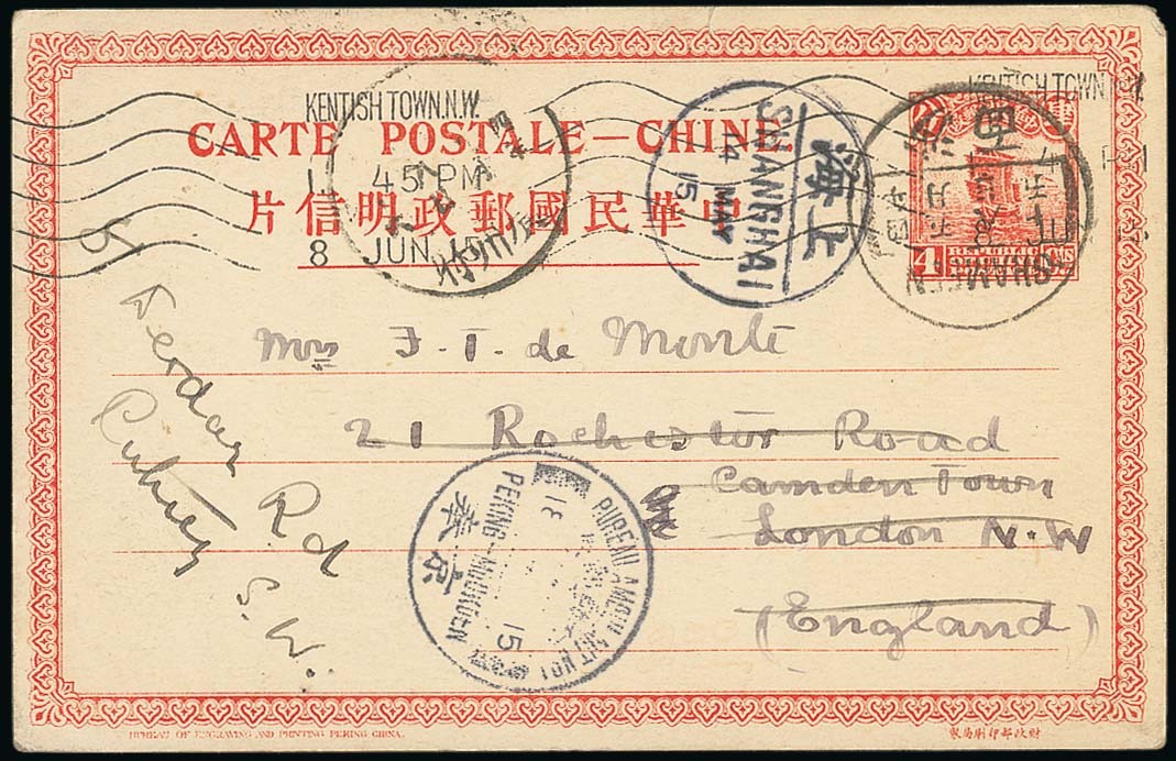 Pukow ku - Tientsin: 1915 (8 May) 4c. Junk postal stationery envelope to London cancelled by Shameen c.d.s., with Shanghai bilingual transit (14.5) alongside, also bearing "bureau ambulant no.2/pukow ku - tientsin" c.d.s. (on the reverse) (17.5) and "bureau ambulant no.1/peking - moukden" c.d.s. (18.5) on the address side. Redirected on arrival with Kentish Town machine postmark (8.6). Fine and a good double t.p.o. card. Photo