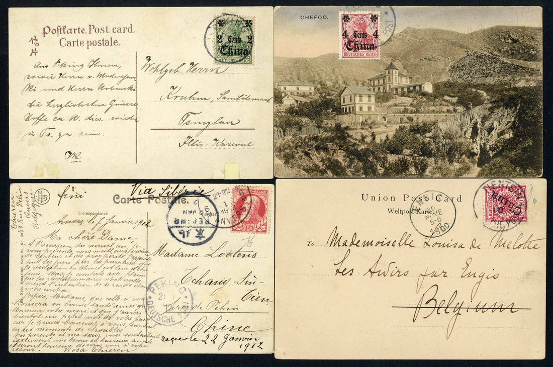 1900-12, a group of three cards cancelled in Chefoo, Peking and Tientsin; also an incoming card from Belgium to Peking with German Office Peking arrival and bilingual c.d.s. (4 cards)