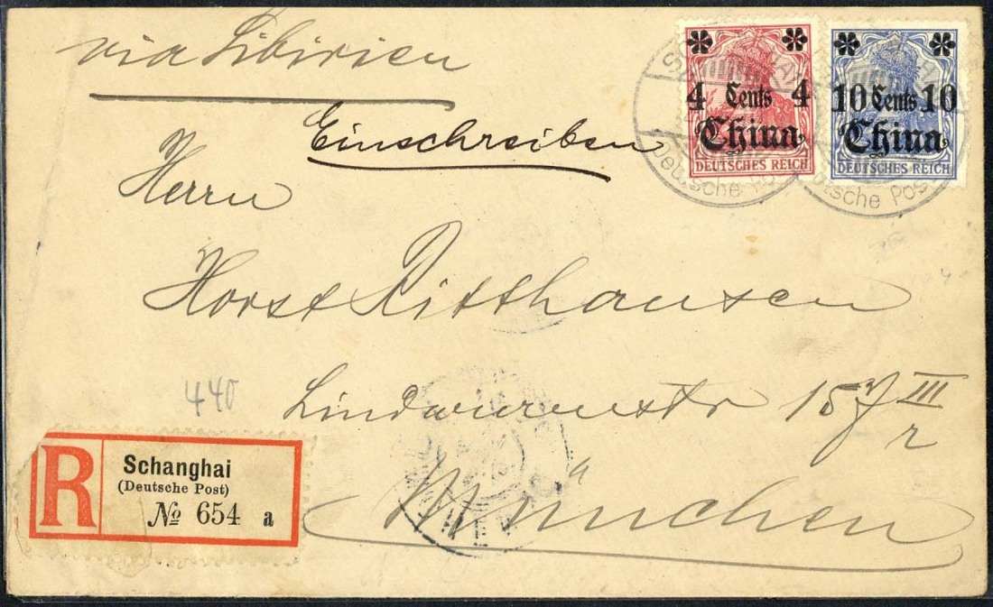 1910 (20 July) envelope registered to Munich "via Sibirien" bearing 1905 2c. on 10pf. and 10c. on 20pf. tied by "Schanghai" c.d.s. with the registration label at foot, arrival c.d.s. (6.8) on the reverse