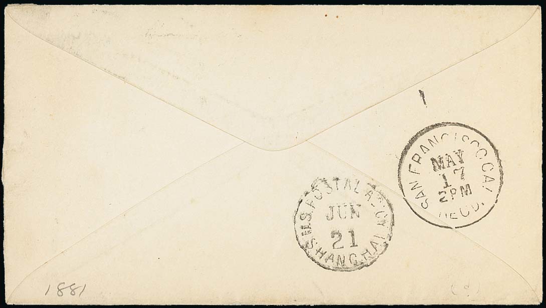 Incoming Mail: 1881 (10 May) envelope to the U.S. Consul, Foochow "Via San Francisco" bearing 1875 Taylor 5c. blue cancelled by Exeter obliterator, the reverse with San Francisco (17.5) and "u.s. postal agency/shanghai" c.d.s. (21.6). With manuscript endorsement of despatch and answering. Photo