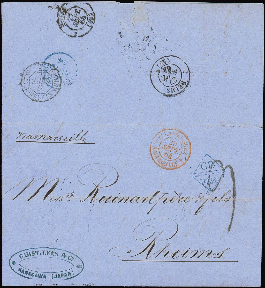 1861-65: GB/1f22 4/10 c: 1864 (23 July) blue commercial wrapper from Kanagawa, Japan to Rheims in France "via Marseilles" bearing a good strike of the diamond accountancy mark and, on the reverse, Hong Kong transit (12 Aug.). With handstruck "9" in black, Marseilles, Strasbourg and Paris transit c.d.s. and Reims arrival (27.9). Clean and fine. Photo