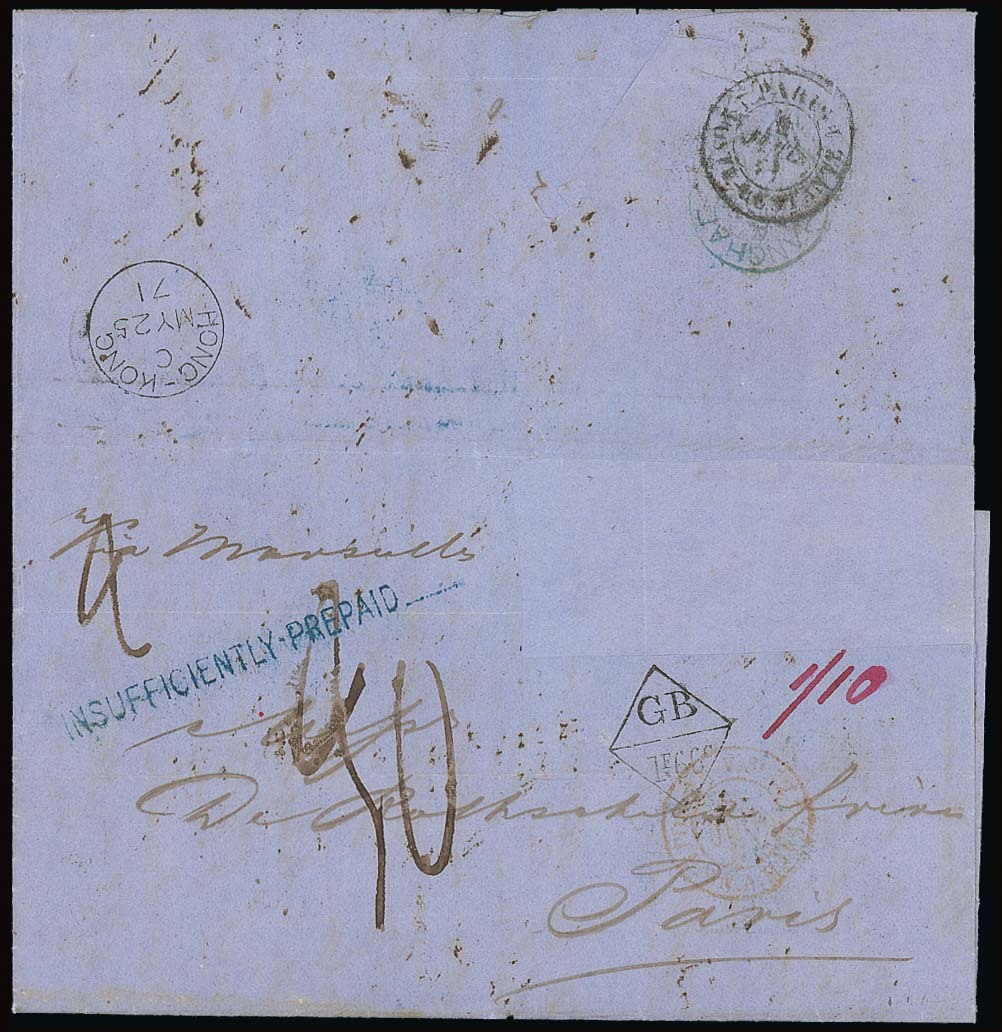 — 1871 (19 May) blue commercial entire from Shanghai to Paris "via Marseilles" with Shanghai despatch c.d.s. on the reverse, bearing a good strike of the type N diamond accountancy handstamp with neat Hong Kong c.d.s. (25.5) on the reveres, rated "1/10" in red ink with handstruck "20" in black and a very good strike of the straight-line "insufficiently prepaid__" handstamp in blue and two french transit c.d.s. There is a repaired patch in the top right corner of this cover although no postage stamps are missing. An appealing cover nevertheless and a good example of this scarce marking. Webb R. Photo