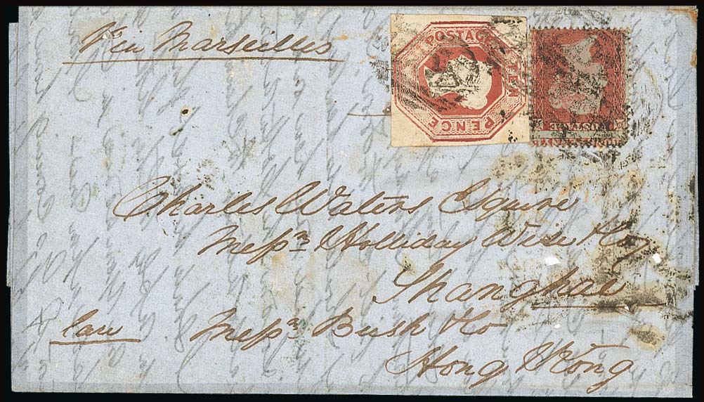 Great Britain: 1854 (4 Aug.) entire to Hong Kong "Via Marseilles" bearing 1d. Stars on blued paper (misperf. showing value at top) with Embossed 10d. brown die 2 with good to very large margins all round, tied by barred oval numerals and bearing, on the reverse, Douglas, Isle of Man despatch c.d.s. in green, London transit and part Hong Kong arrival. A clean and very attractive cover; it is rare to find the embossed stamps with such good margins all round and so fine. Photo