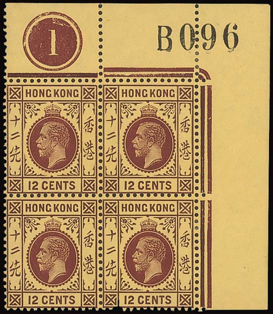 — 12c. deep red-brown on pale yellow, white back, in a corner plate block of four, sheet number "B096", large part original gum; hinge remainders and a few split perforations in the top margin. Photo