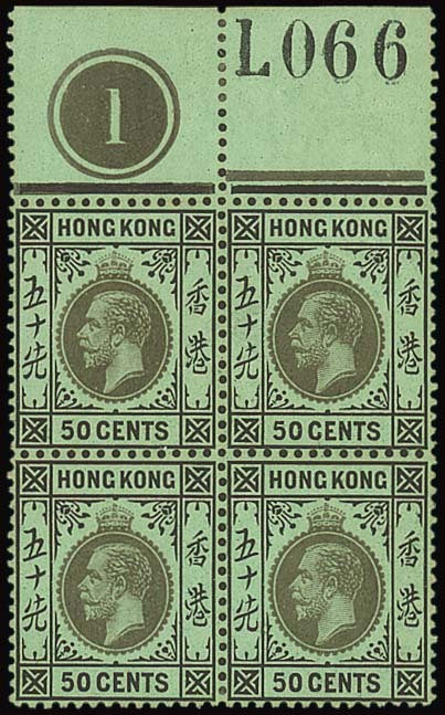 Requisition "L", 50c. grey-bistre and black on emerald surface paper, block of four with plate margin and sheet number "L066", mounted in the margin only; without the side margin. Photo
