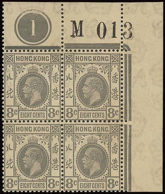 — 8c. pale grey in a corner plate block of four, sheet number "M 013", mounted in the margin only; light even gum toning. Photo
