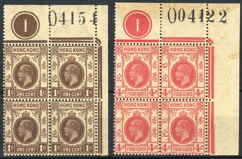 Requisition "O", 1c. deep brown and 4c. light rose-carmine in a corner plate blocks of four, sheet numbers "O4154" and "O04122" respectively; some light gum ageing and 1c. with narrow margin at right