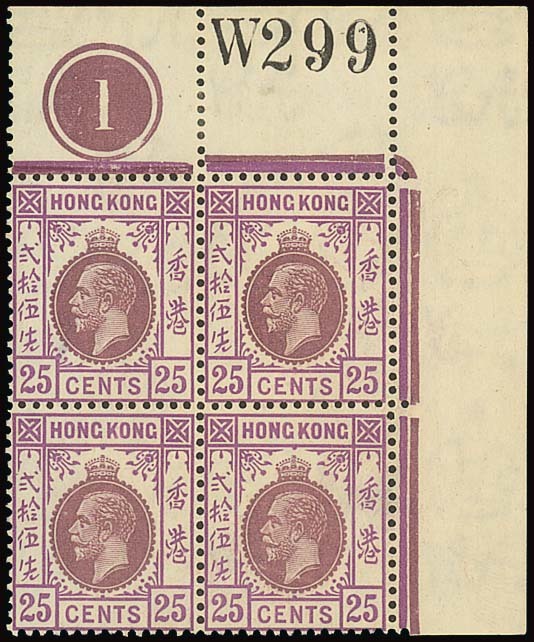 — 25c. pale reddish purple and magenta in a corner plate block of four, sheet number "W299", mounted in the margin only. A fine and attractive block. Photo