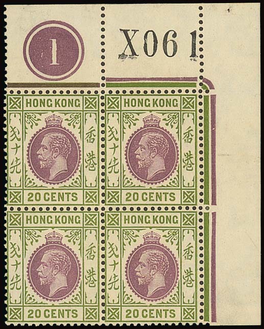 Requisition "X", 20c. reddish purple and dull yellow-green in a corner plate block of four, sheet number "X061", mounted in the margin only. Fine and attractive. Photo