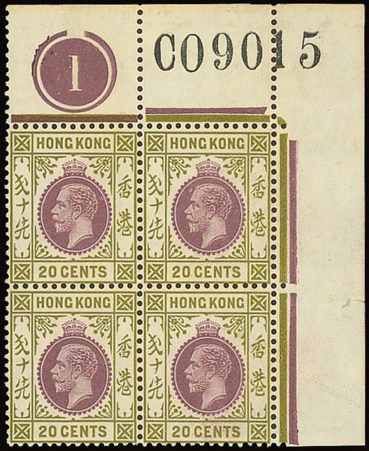Requisition "C", 20c. reddish purple and dull yellow-green in a corner plate block of four, sheet number "C09015", mounted in the margins only; small tear in side margin; fresh. Photo