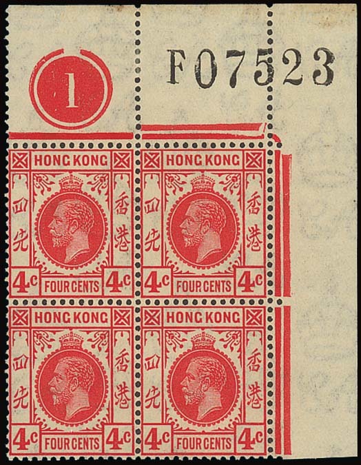 Requisition "F", 4c. rose-scarlet in a corner plate block of four, sheet number "F07523", mounted in the margin only; slight ageing. Photo