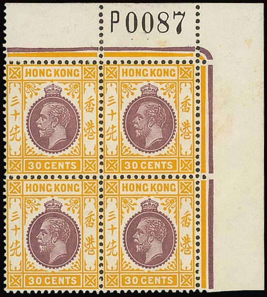 Requisition "P": 30c. reddish purple and bright orange-yellow in a corner block of four, sheet number "P0087", lightly mounted in the top margin only. Fresh and fine. From the lower panes without the plate number. Photo