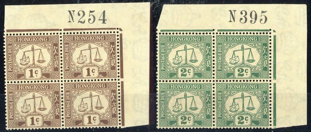 Requisition "N": 1c. deep brown in a corner block of four, sheet number "N254", unmounted mint; some minor gum ageing and 2c. bluish green in a corner block of four, sheet number "N395", unmounted mint