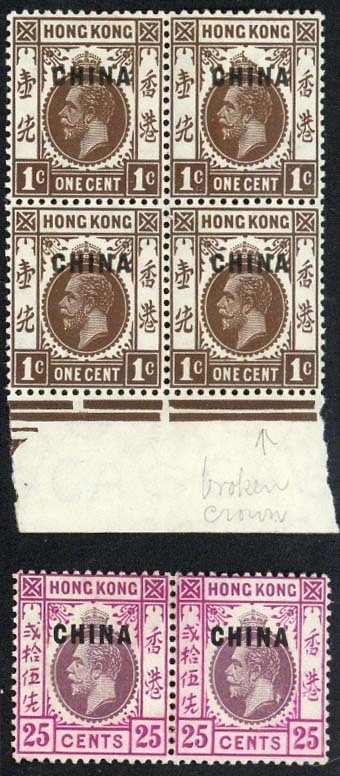 1c. brown in a block of four with lower margin, upper right stamp with broken crown variety, very fine mint. Also 25c. purple and magenta pair showing apparent frame double print variety, mint. Yang BP 1b, BP 9 var.