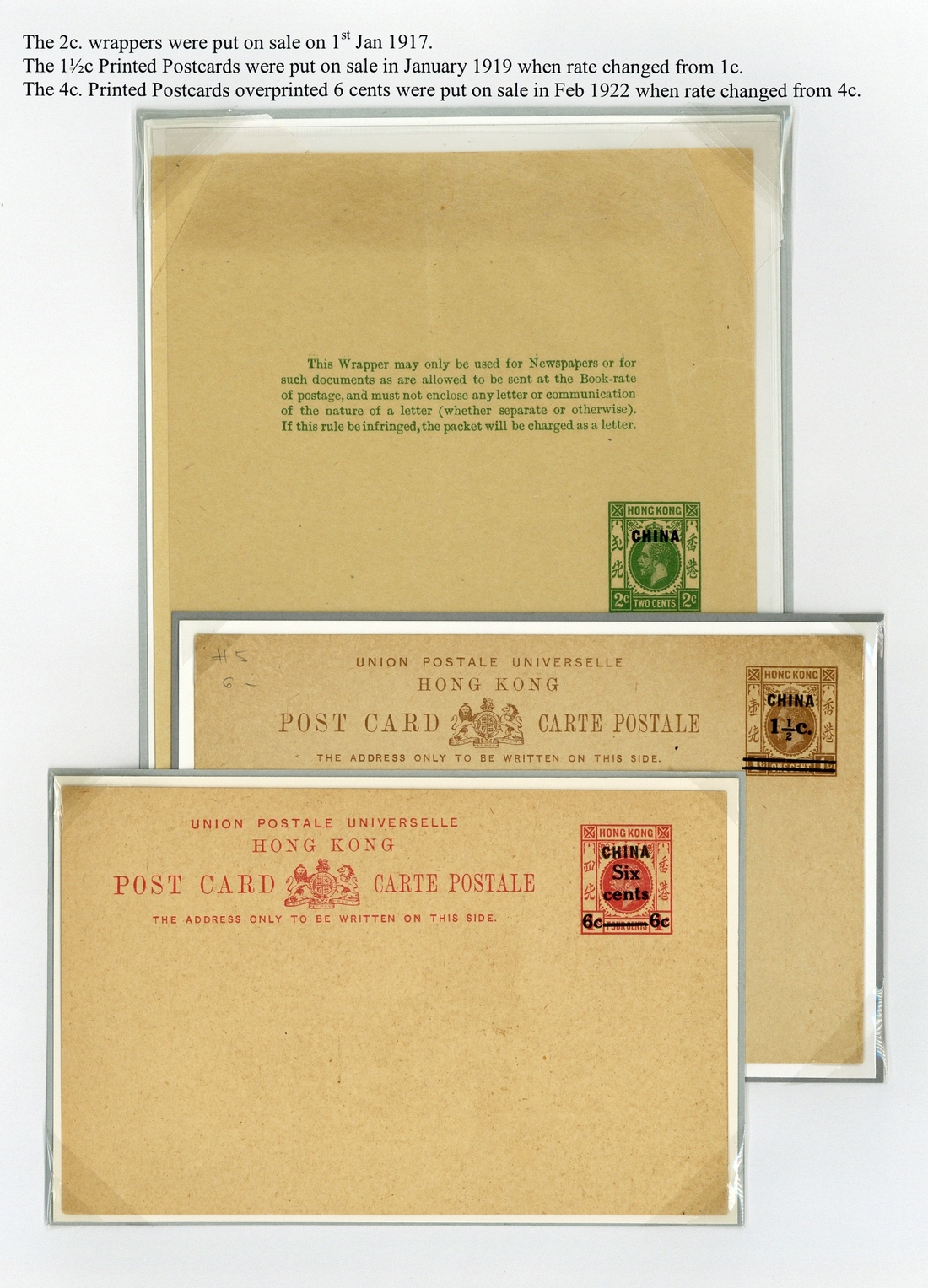 1916-18 postcards, a complete set of six with 1c. brown, 1c. + 1c. reply card, 1½ orange, 4c. carmine, 1½c. on 1c. brown, 6c. on 4c. carmine, plus Newspaper wrapper 2c. green, unused, very fine. Yang P32-37, NW 5