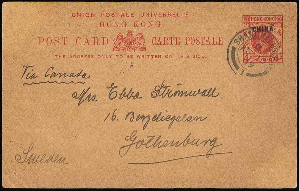 1919 (10 Apr.) 4c. stationery postcard to Sweden via Canada, cancelled by Shanghai Br. P.O c.d.s. Yang P35. Photo
