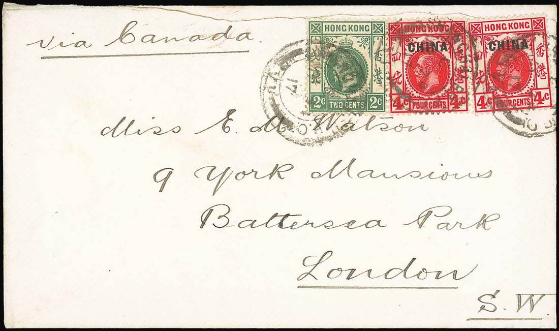 1917 (24 May) envelope to London "via Canada" bearing a combination of overprinted and unoverprinted stamps with K.G.V 2c. green with pair of 4c. "china" tied by Shanghai type L double-ring c.d.s. Fresh and fine. Photo