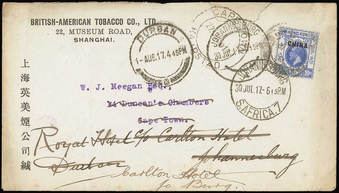1917 (12 June) cover to Cape Town, S. Africa franked with 10c. tied by Shanghai c.d.s., the reverse with Hong Kong (18.6) transit c.d.s., Cape Town (27.7) arrival then re-directed to Johannesburg (30.7) and finally redirected to Durban with (1.8) arrival c.d.s. An interesting item. Photo