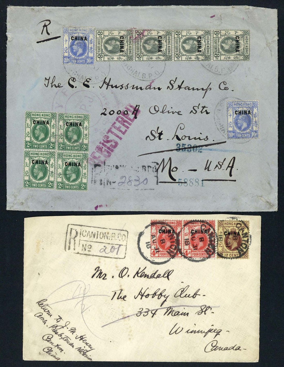 1917-22 a group of three registered covers with 1918 (31 Aug.) registered cover to Canada franked with 4c. (2) and 12c. tied by Canton c.d.s., with black framed "R/canton. b.p.o. no. 201" handstamp, ex Richard C.K.Chan; 1922 (21 Aug.) cover registered to U.S.A. franked with 20c. tied by Tientsin c.d.s. with red framed "R/tientsin. b.p.o no. 6055" handstamp; 1917 (19 Nov.) cover registered to U.S.A. franked with ovpt. "china" 2c. block of 4, 8c. strip of 4 and 10c. (2), tied by oval Shanghai datestamp, alongside with unclear black framed "R/shanghai b.p.o no.2830" handstamp. (3 covers).