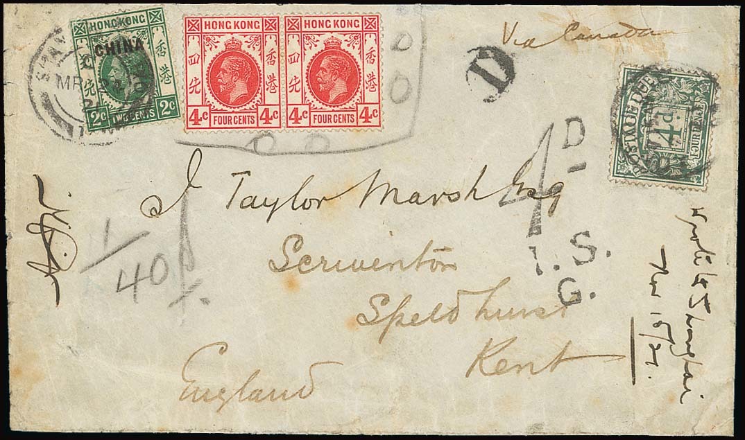 1921 (24 Mar.) cover to England franked with 2c. and Hong Kong K.G.V 4c. pair, the pair 4c. uncancelled and lined off to show their non acceptance, with '"T" in circle alongside and G.B. Postage Due 4d. Photo