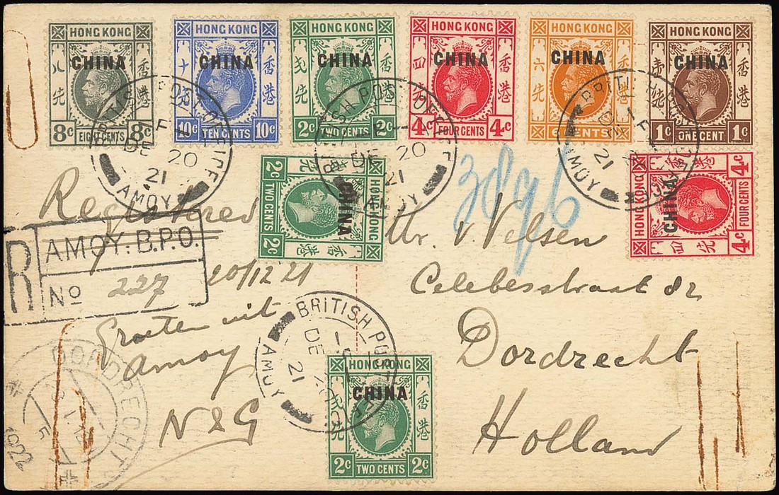 — 1921 (20 Dec.) picture postcard of Amoy registered to Holland franked with 1c., 2c. (3), 4c. (2), 6c., 8c. and 10c. tied by Amoy c.d.s. type Ki code "F" with black framed "R/amoy b.p.o no. 227" handstamp alongside. Very scarce postcard with registered usage. Photo