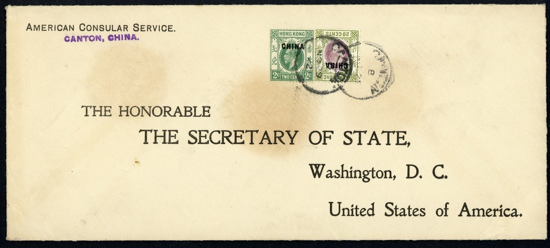 Canton: 1917-22 a group of covers with 1920 4c. rate to U.S.A., three 10c. rate covers including 1917 to U.S.A. and one to Singapore and 1922 cover from the American Consulate to Washington bearing 2c. and 20c. Good to fine. (5 covers)