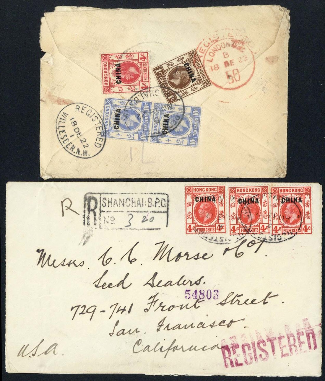Shanghai: 1917-22 a group of registered covers with 1917 envelope to Sweden bearing pair of 10c. tied by the oval datestamp with the boxed registered handstamp, with censor seal at side; 1917 envelope to San Francisco bearing 4c. (3) tied by oval datestamp with the boxed registered handstamp alongside, 1919 envelope to England bearing 6c. and 10c. (2) tied by oval datestamp with a poor strike of the boxed registered handstamp plus 1922 envelope to London (part of address side missing) bearing, on the reverse, 1c., 4c. and 10c. (2) tied by oval datestamp and hooded London registered c.d.s. in red, redirected on arrival with handstruck "3d" tax mark. A good group showing different rates. (4 covers)