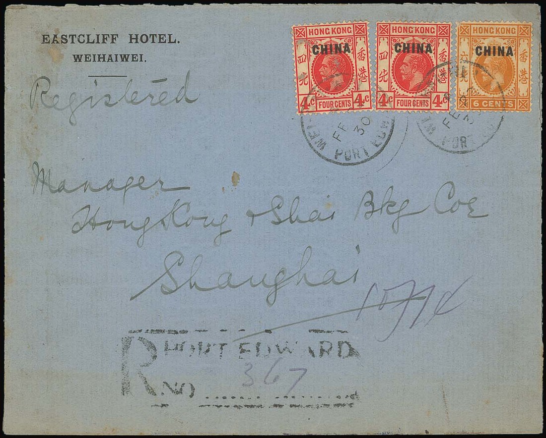 — 1930 (22 Feb.) cover registered to Shanghai franked with 4c. (2) and 6c., tied by Wei Hai Wei c.d.s., alongside black framed "R/port edward no.367" handstamp, the reverse with Shanghai Chinese Post Office arrival c.d.s. Photo