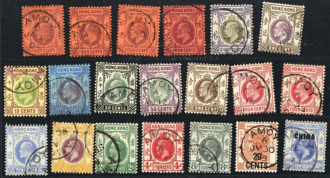 Small group of Amoy and Canton Treaty Port cancellations from Q.V. to K.G.V, mostly Canton c.d.s. on overprinted values 1c. to $1, also two Q.V. 10c. and 12c. with full black "C1" obliterator.