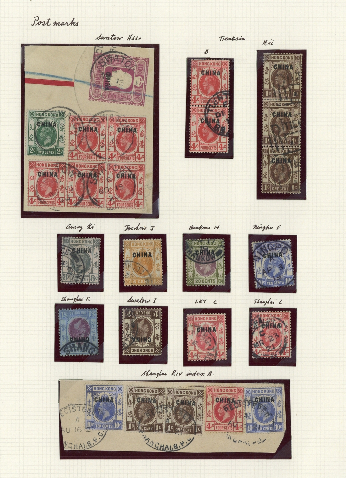 A selection of stamps on six pages with used stamps to $2, includes good postmarks of Amoy, Canton, Ningpo, Swatow on pieces, also "paquebot" on 2c. block of four.