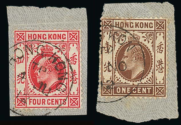 Tai Po: 1912 K.E.VII 1c. and 4c. (2) on individual pieces, each bearing a part or large part strike of the single-ring, type A c.d.s. A scarce and appealing group. (3). Photo
