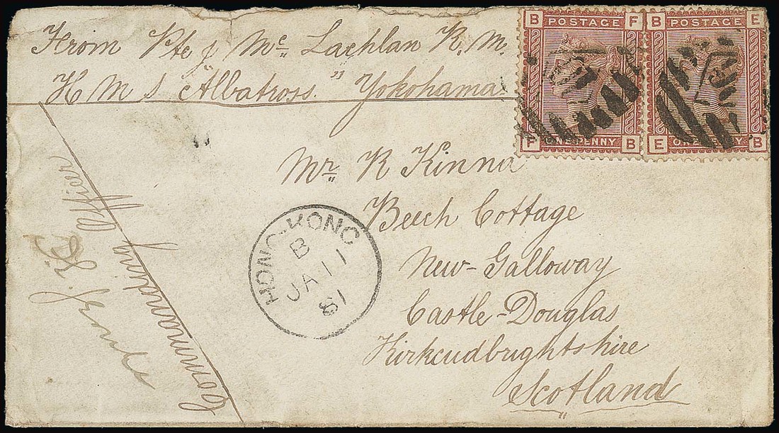 H.M.S. Albatross: 1881 (11 Jan.) neat seaman's envelope from Pte. McLachlan to Scotland whilst the 'Albatross' was stationed in Yokohama and countersigned by the commanding officer and showing a very fine strike of the Hong Kong transit c.d.s. Bears a pair of G.B. 1881 1d. cancelled by London "10" in barred oval, the reverse with Castle Douglas (17.2) and faint New Callows c.d.s. Attractive. Photo