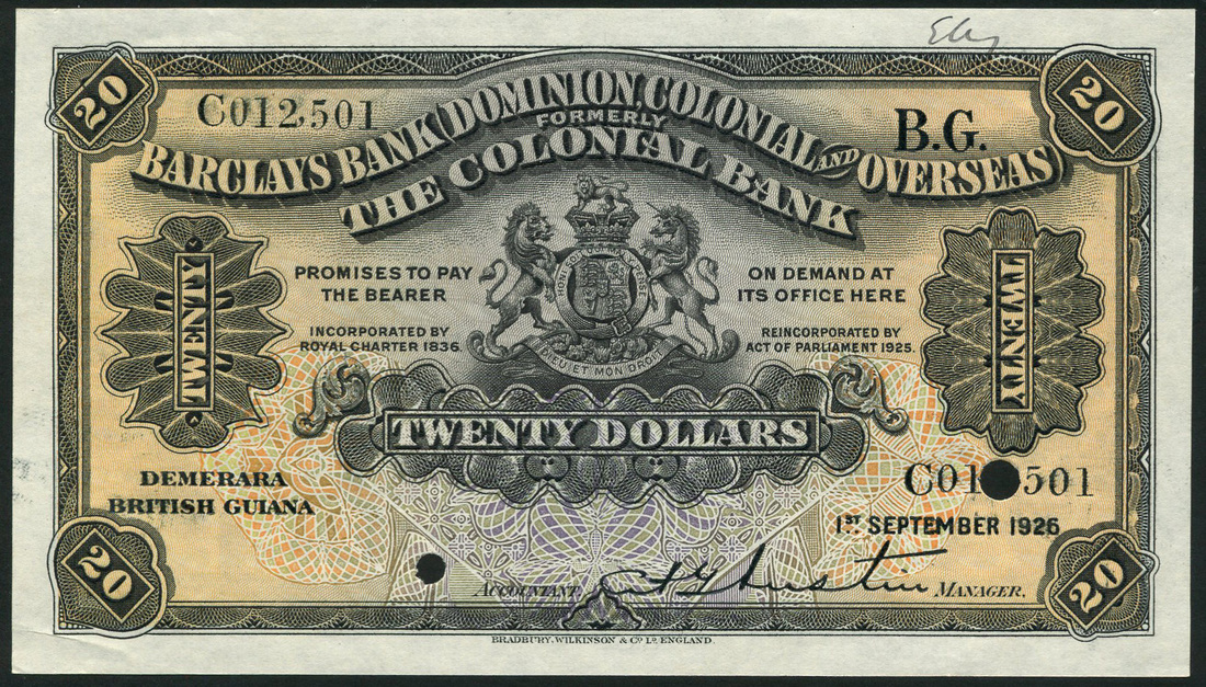 (†) Barclays Bank (Dominion, Colonial and Overseas), British Guiana, specimen $20, Demerara, 1 September 1926, serial number C012,501, signed by Manager at lower right, Letters 'BG' for British Guiana at upper right, black on grey and yellow underprint, coat of arms at centre, value in guilloches at left and right and in four corners, reverse blue, pale blue and pale green, arms at centre, two punch holes