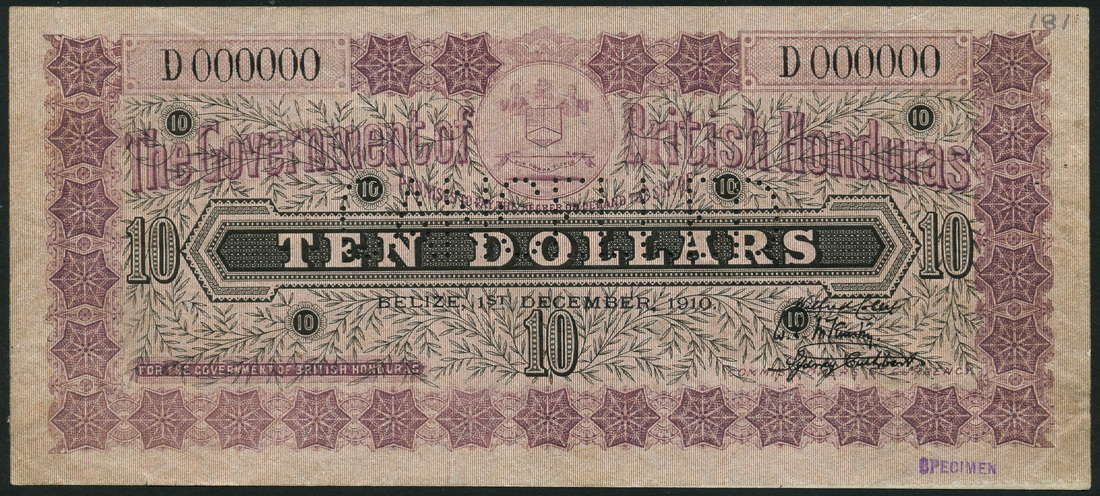 (†) Government of British Honduras, specimen $10, Belize, 1 December 1910, serial number D 000000, violet and grey, arms top centre, value in black tablet at centre, and in field, background of leaves, reverse violet,