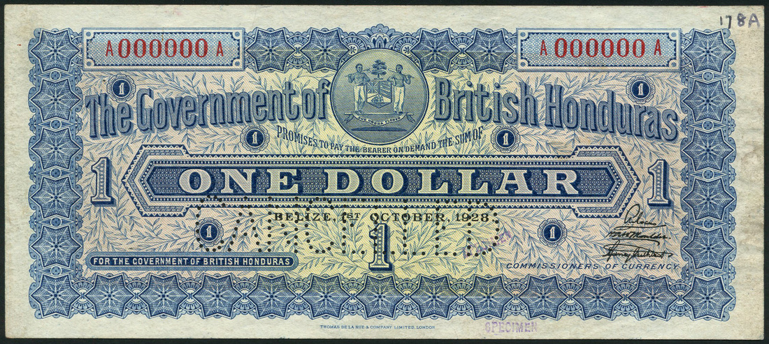 (†) Government of British Honduras, $1, 1 October 1928, serial number A000000A, blue on pink and green underprint, arms at top centre, CANCELLED perforation and small purple SPECIMEN stamp at low right