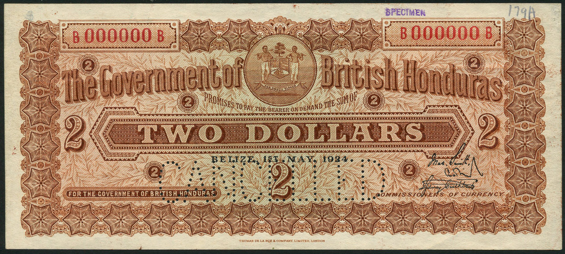(†) Government of British Honduras, specimen $2, 1 May 1924, serial number B000000B, brown, arms at top centre, value in tablet at centre and at left, right and low centre, reverse brown, ornate guilloche, small purple SPECIMEN stamp, large CANCELLED perforation