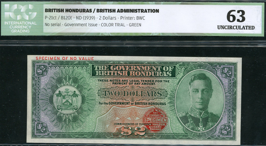 Government of British Honduras, colour trial $2, ND (1939), no serial number, green and multicoloured, George VI at right, arms at left, reverse multicoloured guilloche pattern, bank title, no signatures, red SPECIMEN overprint in top margin, red Bradbury Wilkinson seal low right