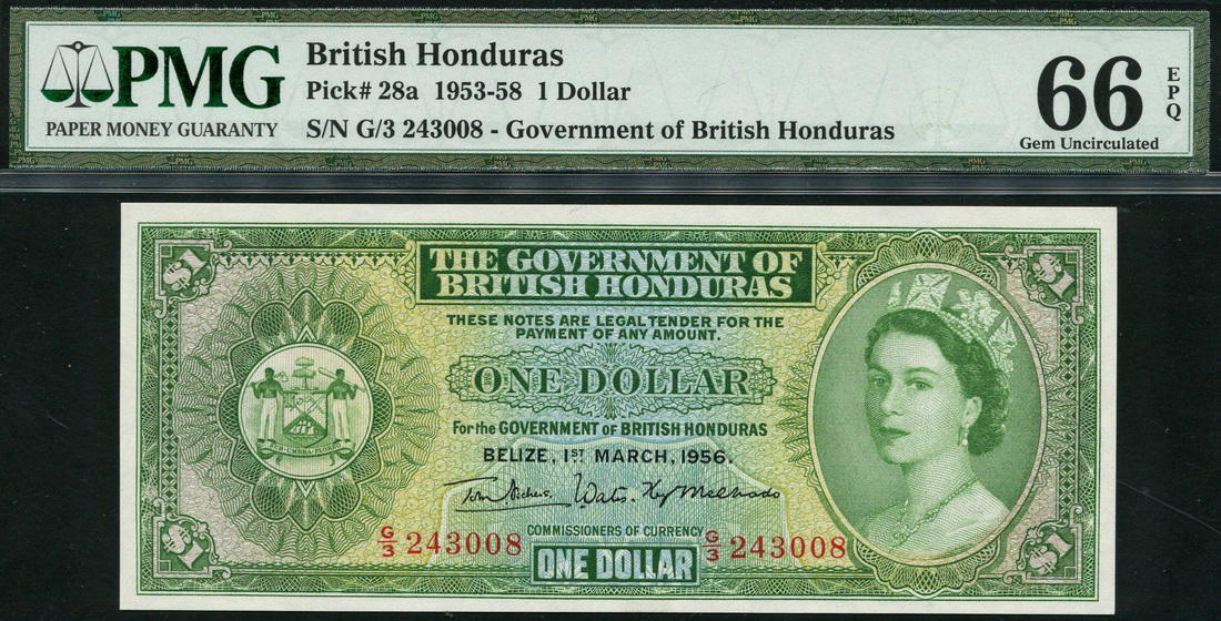Government of British Honduras, $1, 1 March 1956, serial number G/3 243008, green on pastel colour underprint, portrait Queen Elizabeth II at right, arms at left, value in each corner and at centre, revere, bank turtle within guilloche pattern