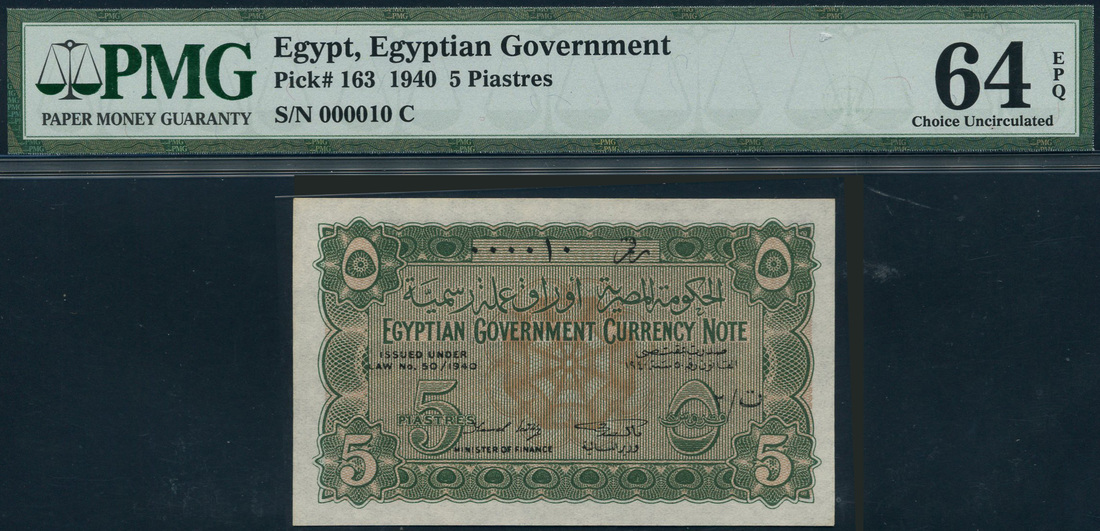 (x) Egyptian Government Currency Note, 5 piastres, 1940, serial number 000010, green on brown underprint, value at low left and right and each corner, reverse brown, Aswan Dam at centre, Kamel Sedky signature