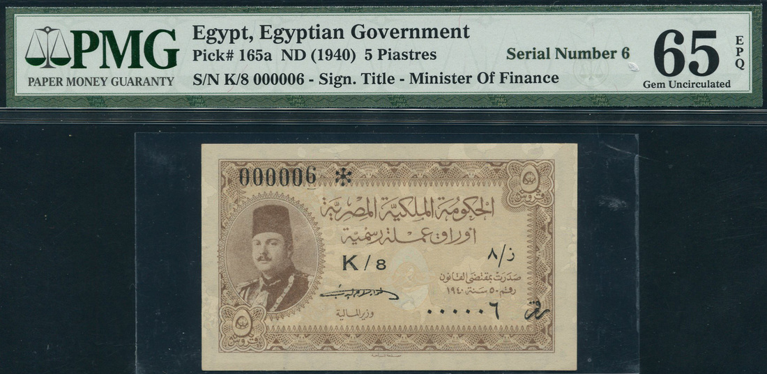 (x) Egyptian Government Currency Note, 5 piastres, ND (1940), serial number K/8 000006 brown on tan underprint, King Farouk at left, value at low left and top right, reverse dark blue, Fouad Seragiddine signature