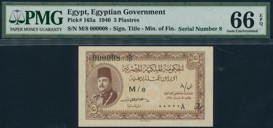 (x) Egyptian Government Currency Note, 5 piastres, ND (1940), serial number M/8 000008 brown on tan underprint, King Farouk at left, value at low left and top right, reverse dark blue, Fouad Seragiddine signature